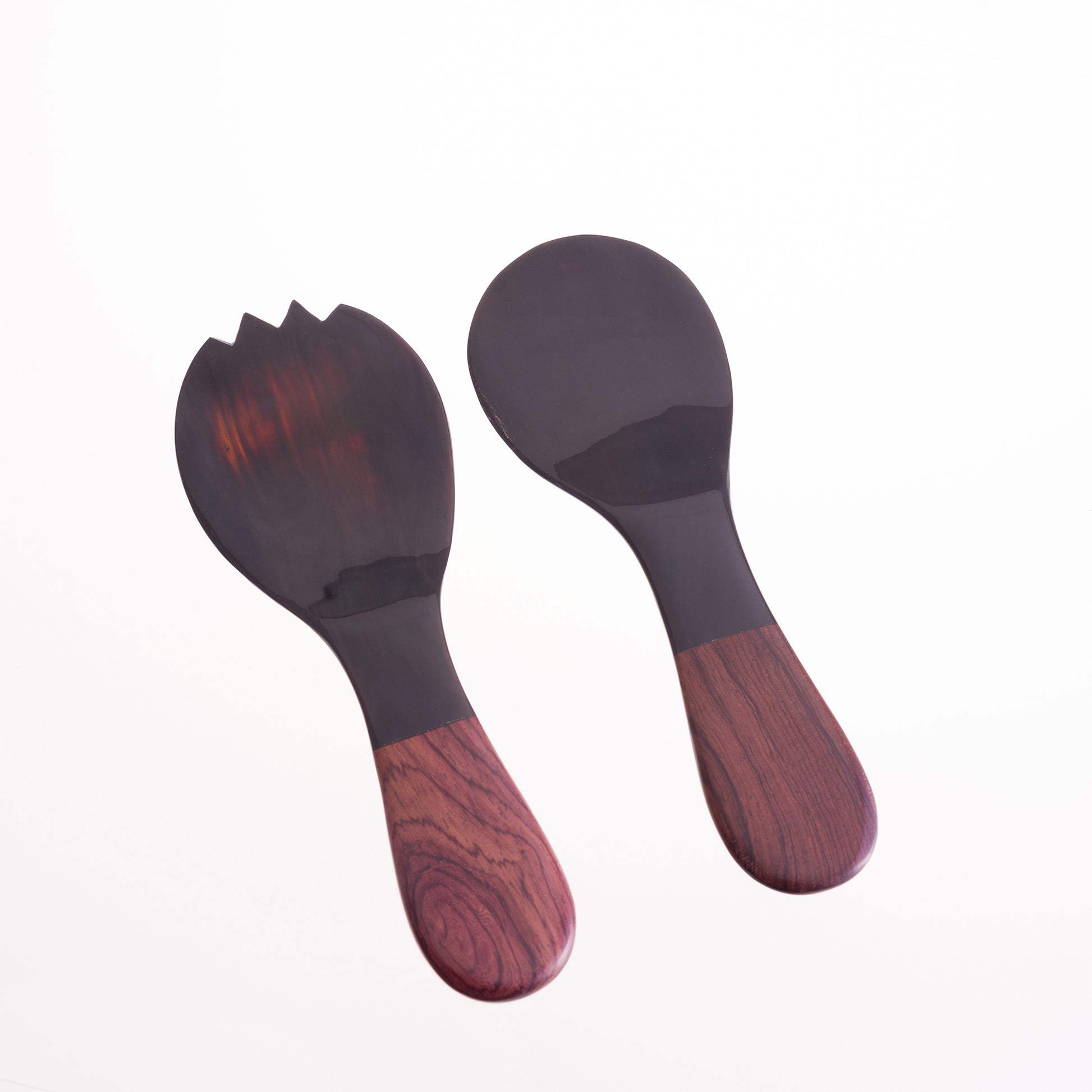 You can get a firm grip on your salad with these short handled salad servers. Made from black horn with contrasting rosewood handles, every pair is totally unique.