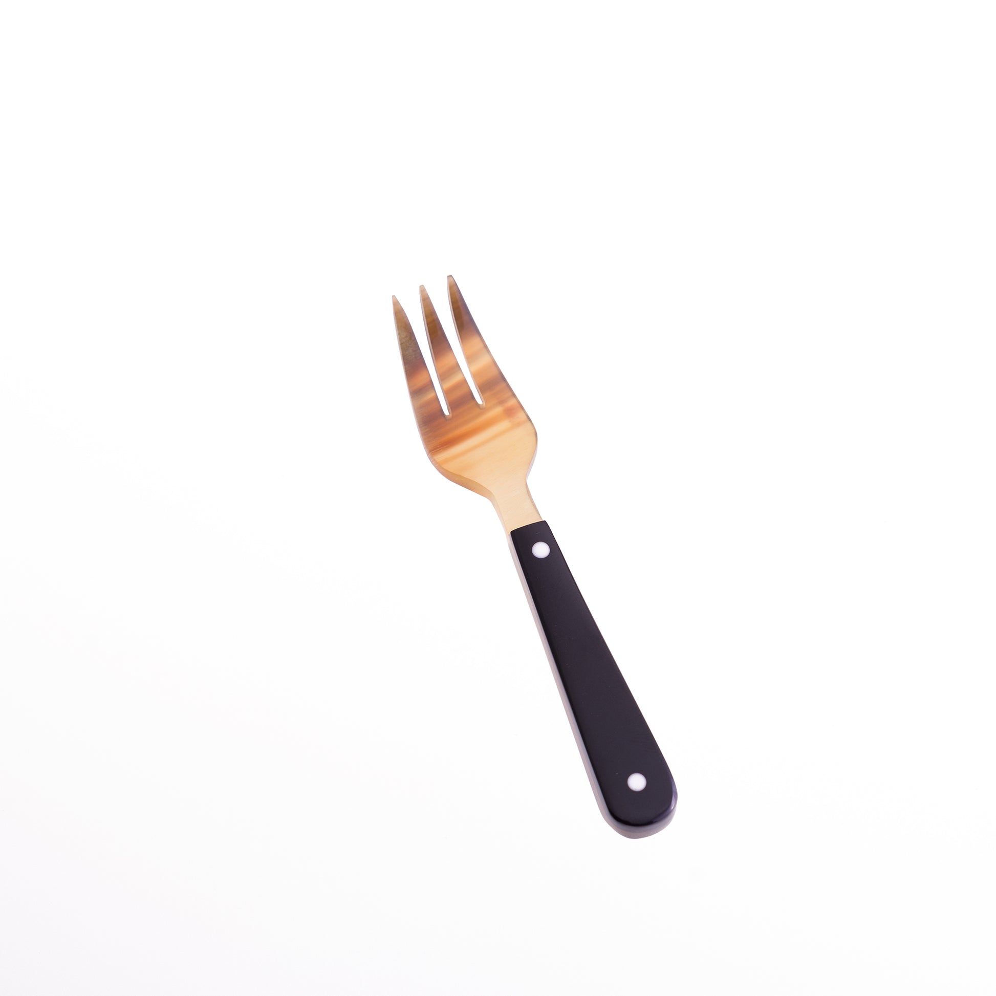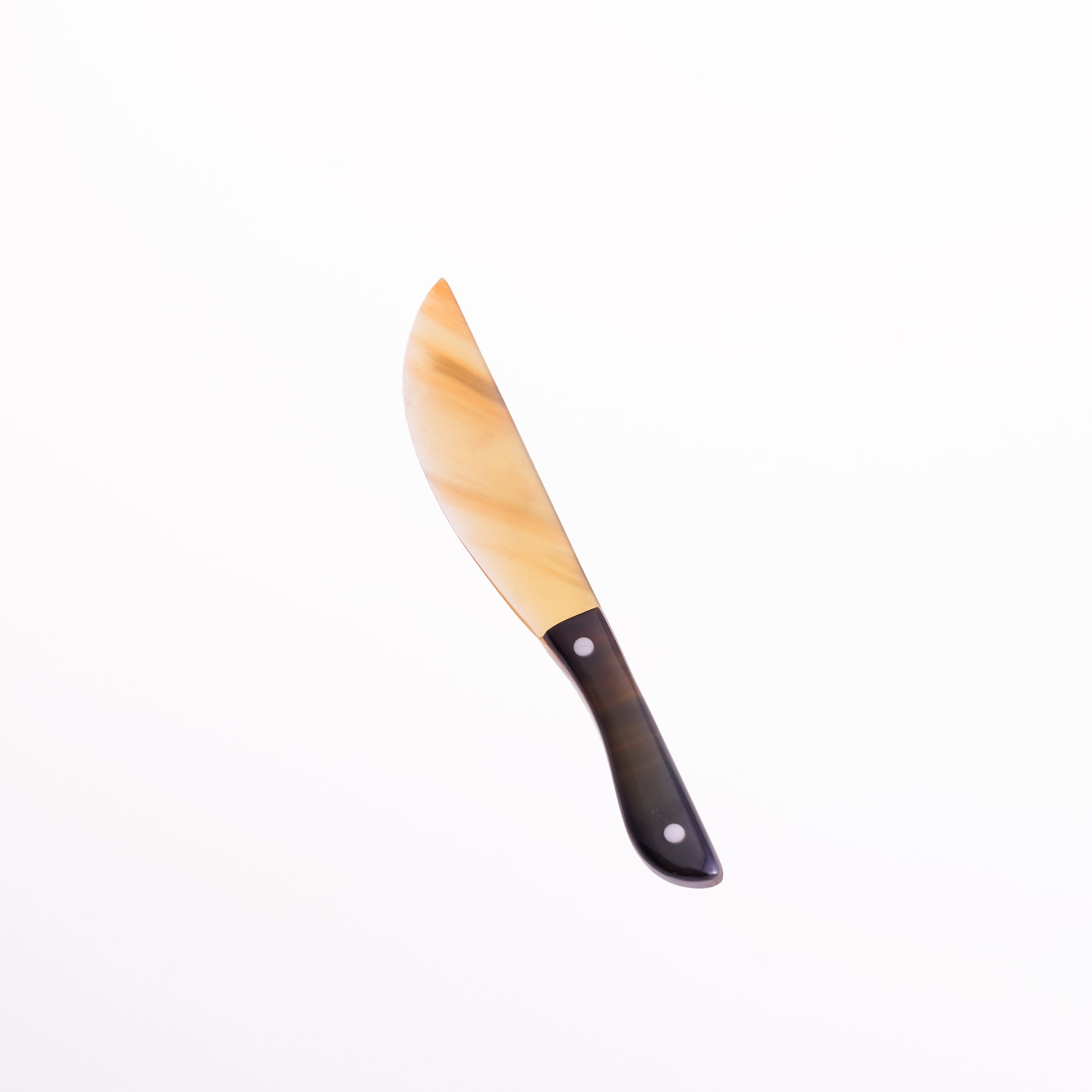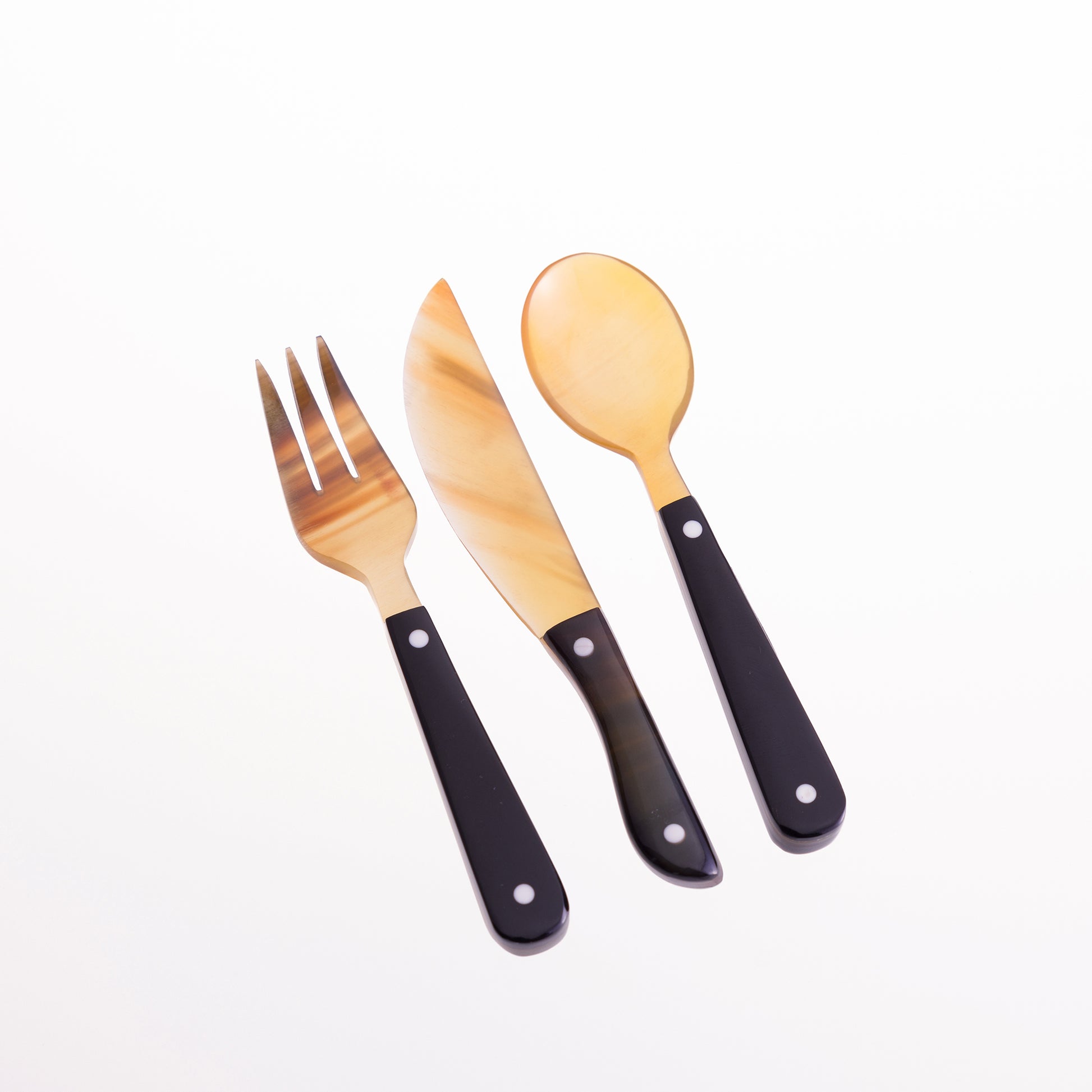 Natural horn with black horn handle. Sold as a set here but can be purchased individually on the 'Butter knives, dishes, forks, teaspoons' page.